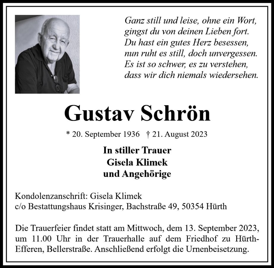 wir wünschen Ihnen von Herzen viel Kraft, dass Sie Menschen um sich haben, die Ihnen in dieser schweren Zeit beistehen und Halt geben. Zusätzlich können Sie auf dieser Gedenkseite Erinnerungen teilen und so das Andenken gemeinsam wachhalten.