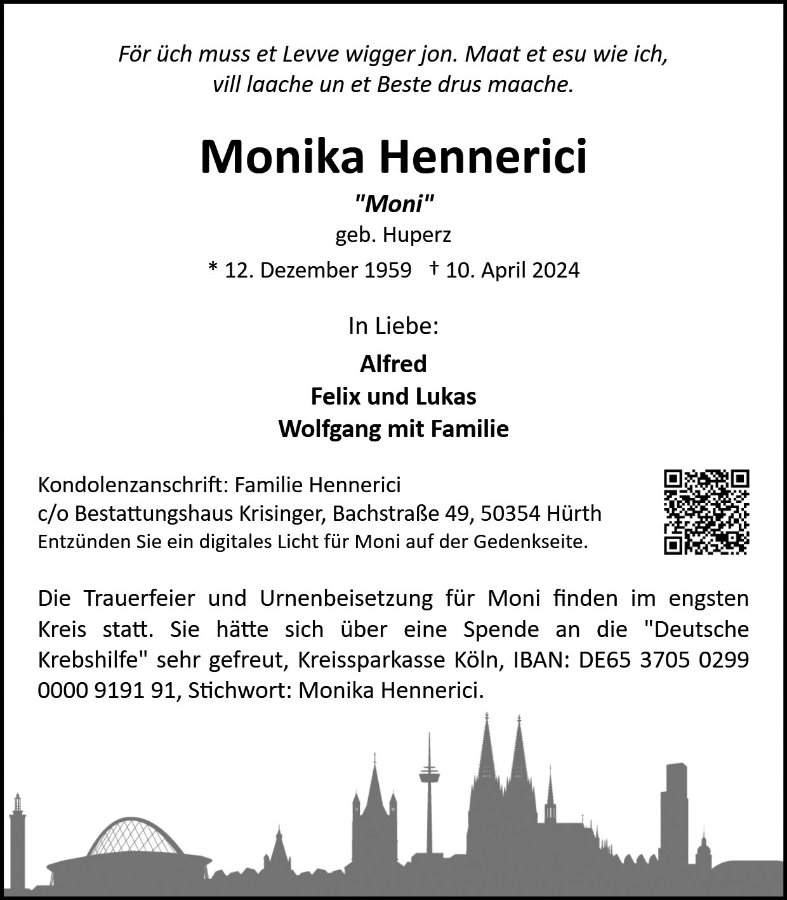 Moni hätte sich über eine Spende an die "Deutsche Krebshilfe" sehr gefreut, Kreissparkasse Köln, IBAN: DE65 3705 0299 0000 9191 91, Stichwort: Monika Hennerici